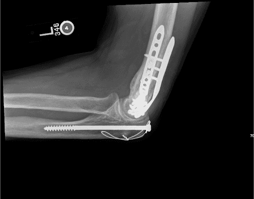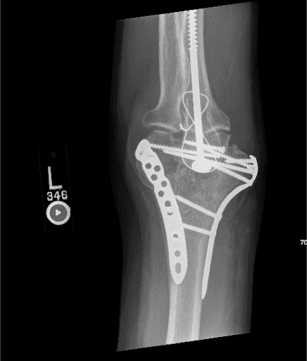 Figure 2. Lateral view of the Left elbow x-ray showing the position of the plates pre-op.