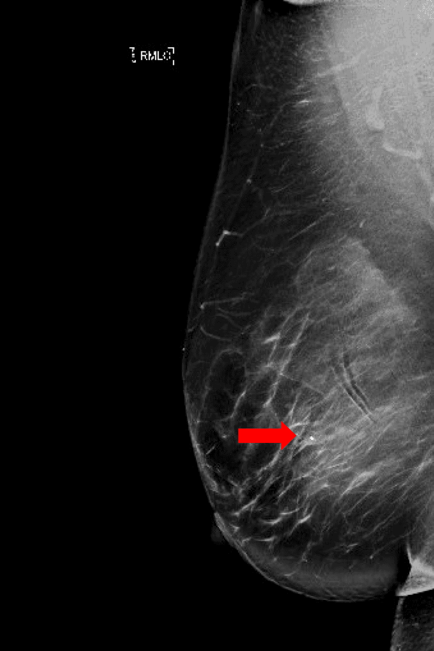 Figure 2a. Post-biopsy diagnostic mammogram. Right mediolateral oblique view, including an enlarged area for better detail of the coiled biopsy clip in the area of concern (arrow).