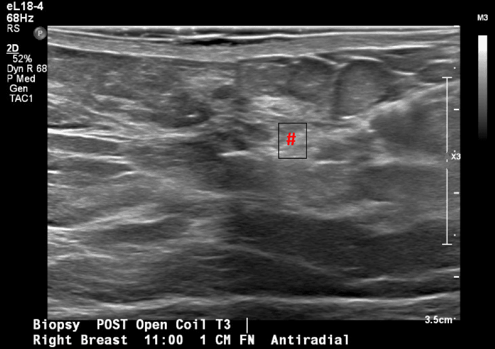 Figure 3. Ultrasound-guided localization and biopsy of the breast mass in question, first seen on screening mammogram. Post-biopsy image includes typical tissue changes seen once a core-needle biopsy is performed (hash mark).