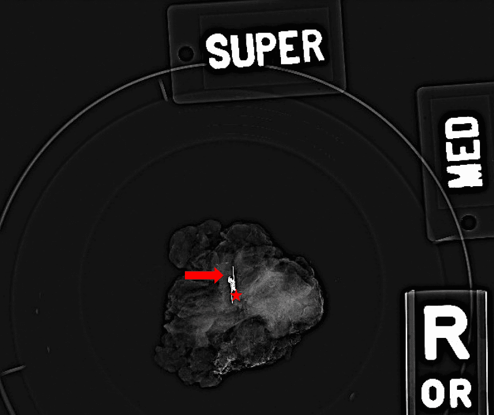 Figure 4. The intraoperative X-ray of the excised mass. Used to confirm the biopsied area with the coiled clip (arrow), and the previously placed Savi Scout, shaped like a barbell (star) is removed. When necessary, post-excision X-rays will also reveal if there is any remaining concerning tissue present at the margins of the excised mass.